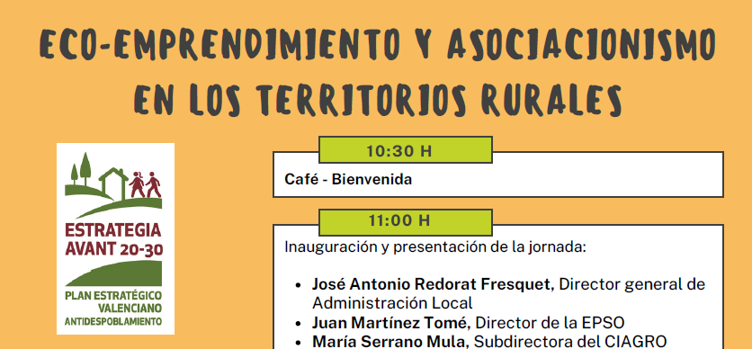 Os invitamos a la Jornada sobre eco-emprendimiento y asociacionismo en territorios rurales, que se celebrará el martes 4 de noviembre de 2025 en la Sala de Grados del Edificio Tudmir, Campus de Orihuela (UMH). El evento comenzará a las 11:00 H (con café de bienvenida a las 10:30 H) e incluirá dos mesas redondas sobre plataformas de apoyo y experiencias que aportan valor al territorio. La jornada está organizada por profesorado del Máster.